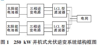 以由兩臺125 kW 三相逆變器并機組成的250kW 光伏逆變系統(tǒng)為例, 其常用的結(jié)構(gòu)框圖如圖1所示。其中三相逆變電路采用多電平逆變拓?fù)洌瑸V波器采用LCL 型濾波器,為了保證濾波器有足夠的零序電抗器,前級濾波電抗器需要采用3 個獨立的單相鐵硅粉芯電抗器組成;后級濾波電抗器由于電流諧波較少,可以采用價格相對便宜的三相硅鋼電抗器[6]。